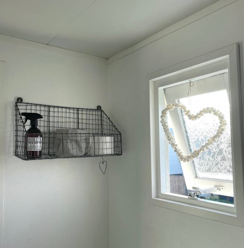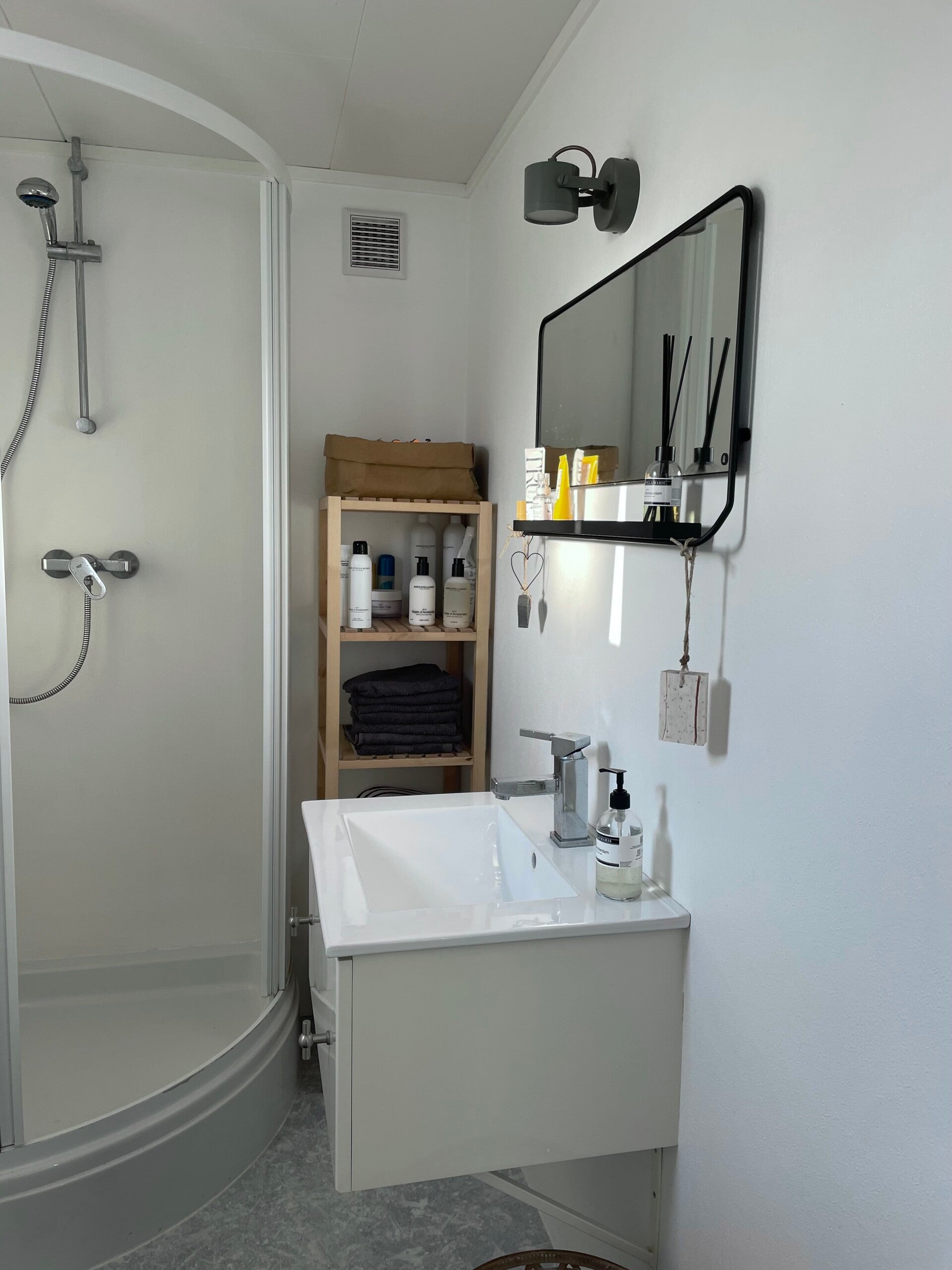 Eenvoudige badkamer met douchecabine voorzien van halfronde schuifdeuren en een mengkraan met instelbare douchekop.